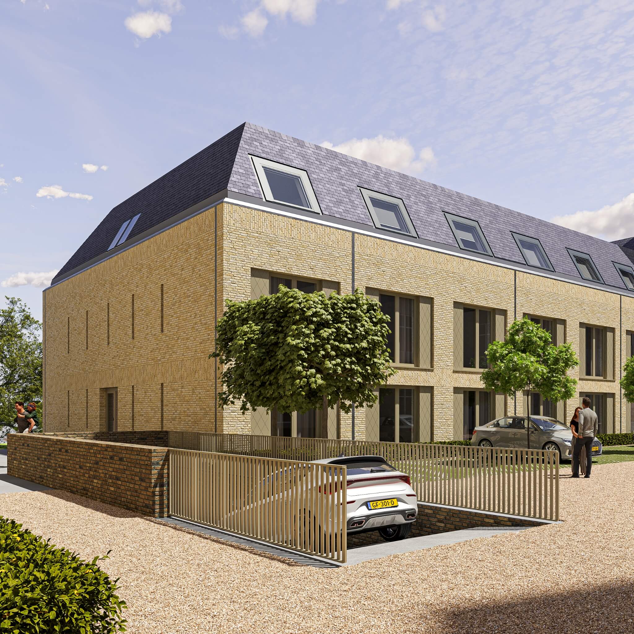 Het nieuwe appartementencomplex voegt zich naadloos in het historische ensemble van het neogotische klooster uit 1883. De architectuur is eigentijds, maar met respect voor de omgeving: beige gevels met mergelaccenten, antraciete daken en verfijnde details die perfect aansluiten bij het karakter van het kloostergebouw. Het resultaat is een woonomgeving die nieuw aanvoelt, maar vanzelfsprekend thuishoort op deze plek.