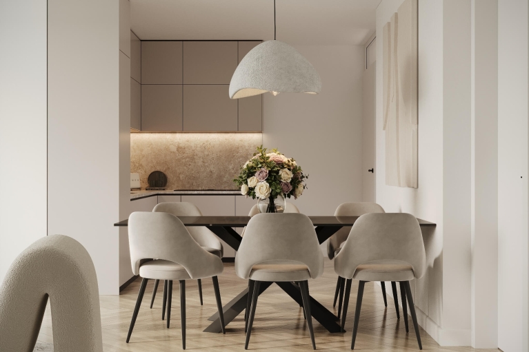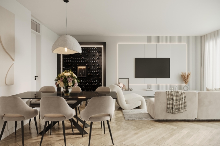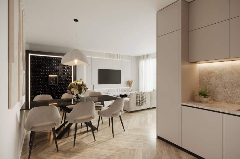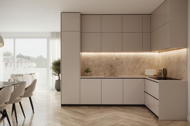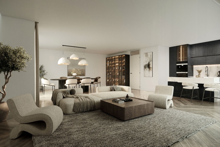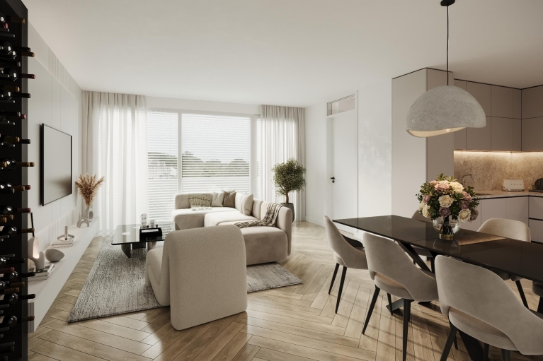 De woonkamer, eetkamer en keuken vormen samen een fraai leefgebied van circa 35 m². Er is alle ruimte voor een royale zithoek, een lange eettafel én een strak uitgevoerde keuken. Vanuit de woonkamer stap je zo het loggia op, ideaal voor een rustig moment in de ochtendzon.